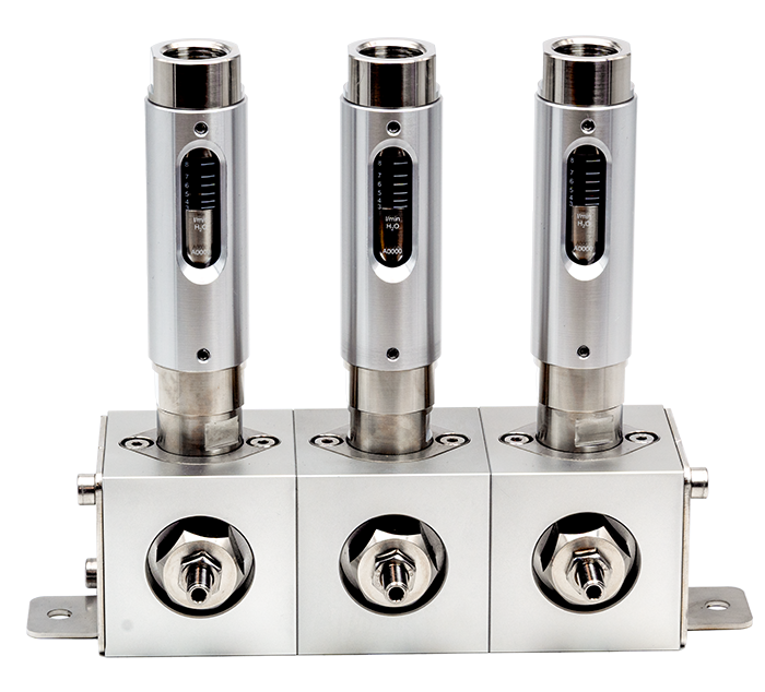 Ventilblock mit zentraler Versorgung zur Verwendung mit Strömungswächtern oder -anzeigern.