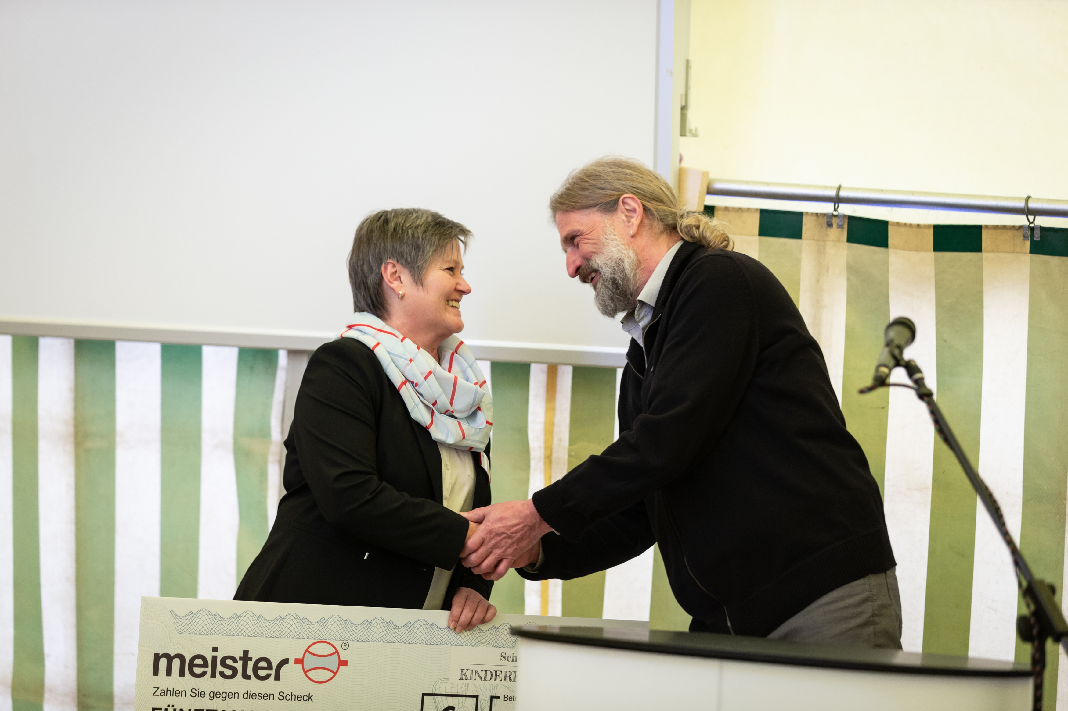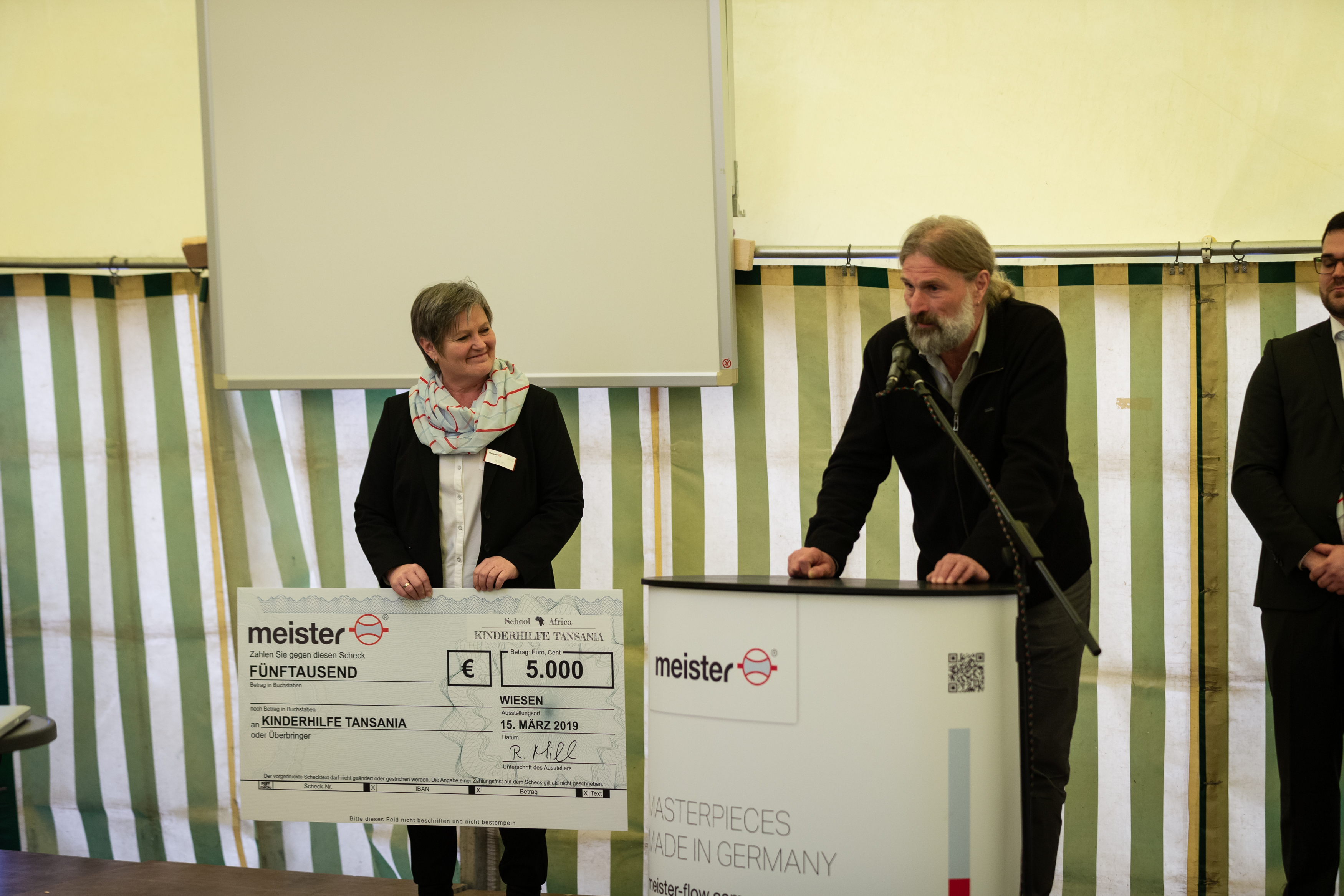 FIRMENGRÜNDERIN ROSEMARIE MILL (links) ÜBERREICHT DEN SCHECK ÜBER 5.000€ AN WERNER FRIEDEL (rechts) VON DER KINDERHILFE TANSANIA